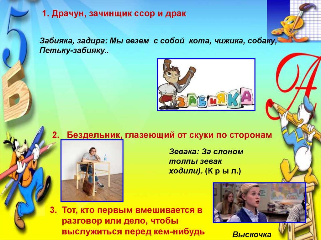1. Драчун, зачинщик ссор и дракЗабияка, задира: Мы везем с собой кота, чижика, собаку,