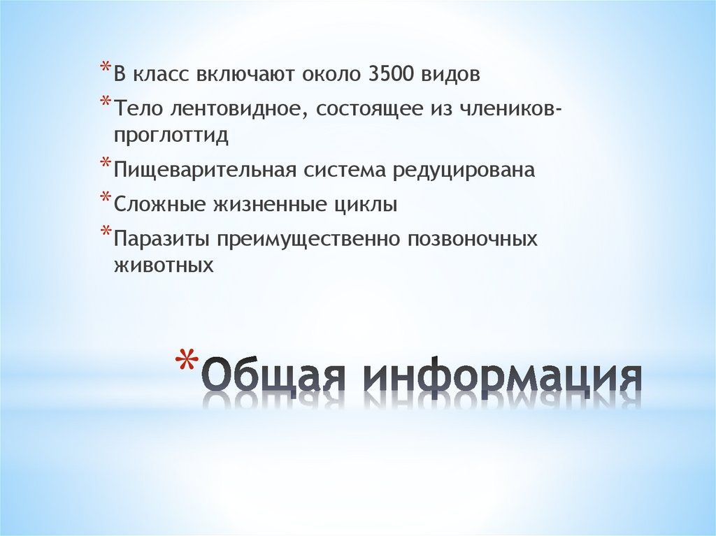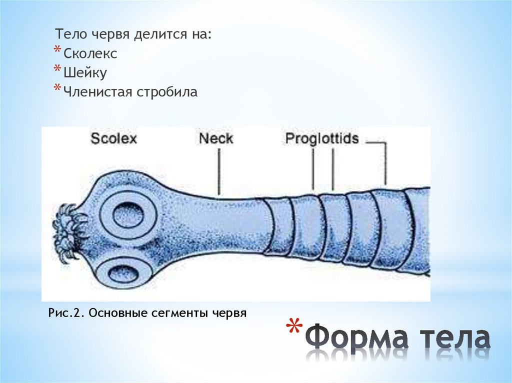 * В класс включают около 3500 видов* Тело лентовидное, состоящее из члениковпроглоттид