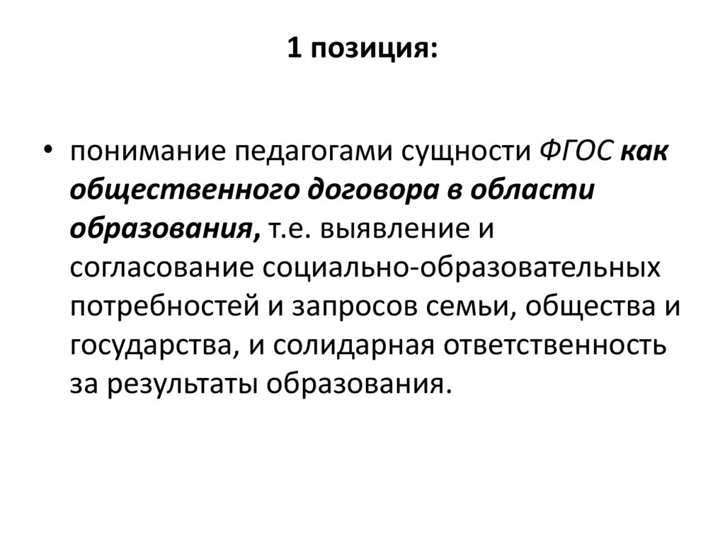 1 позиция:• понимание педагогами сущности ФГОС как