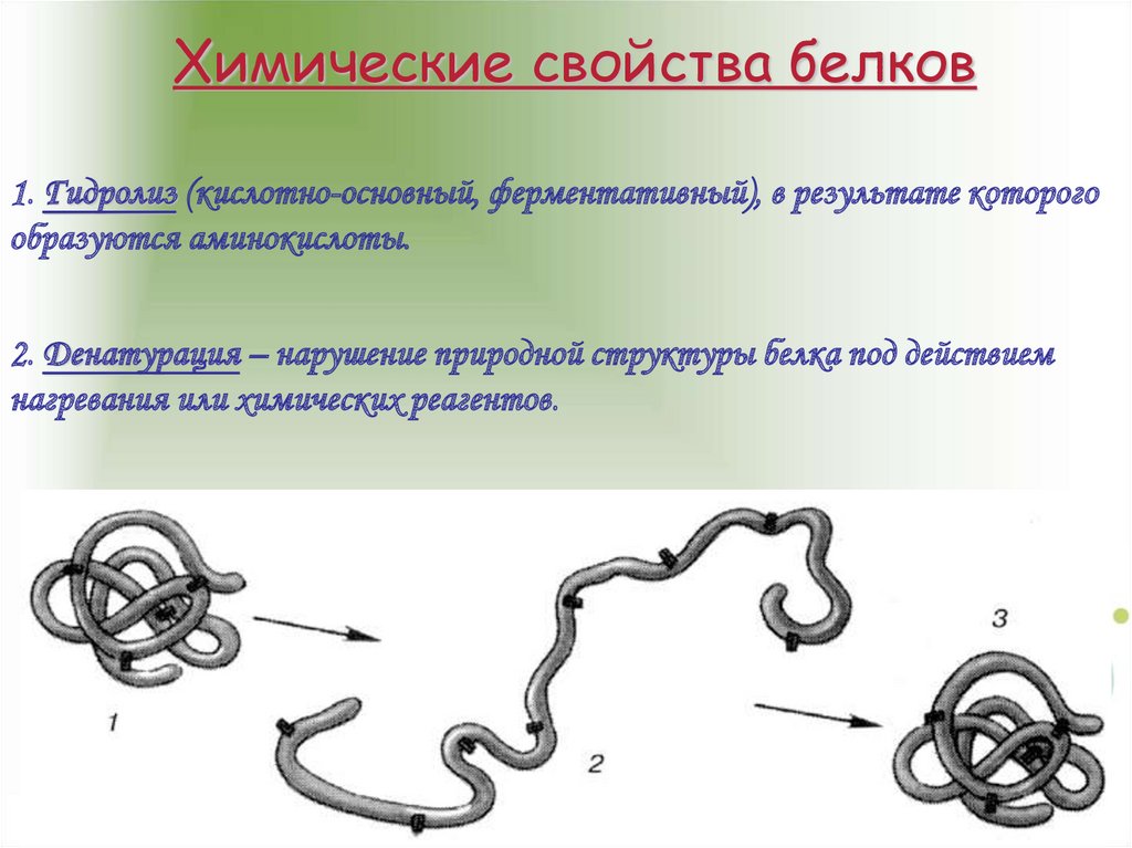 Химические свойства белков1. Гидролиз (кислотно-основный, ферментативный), в результате которого