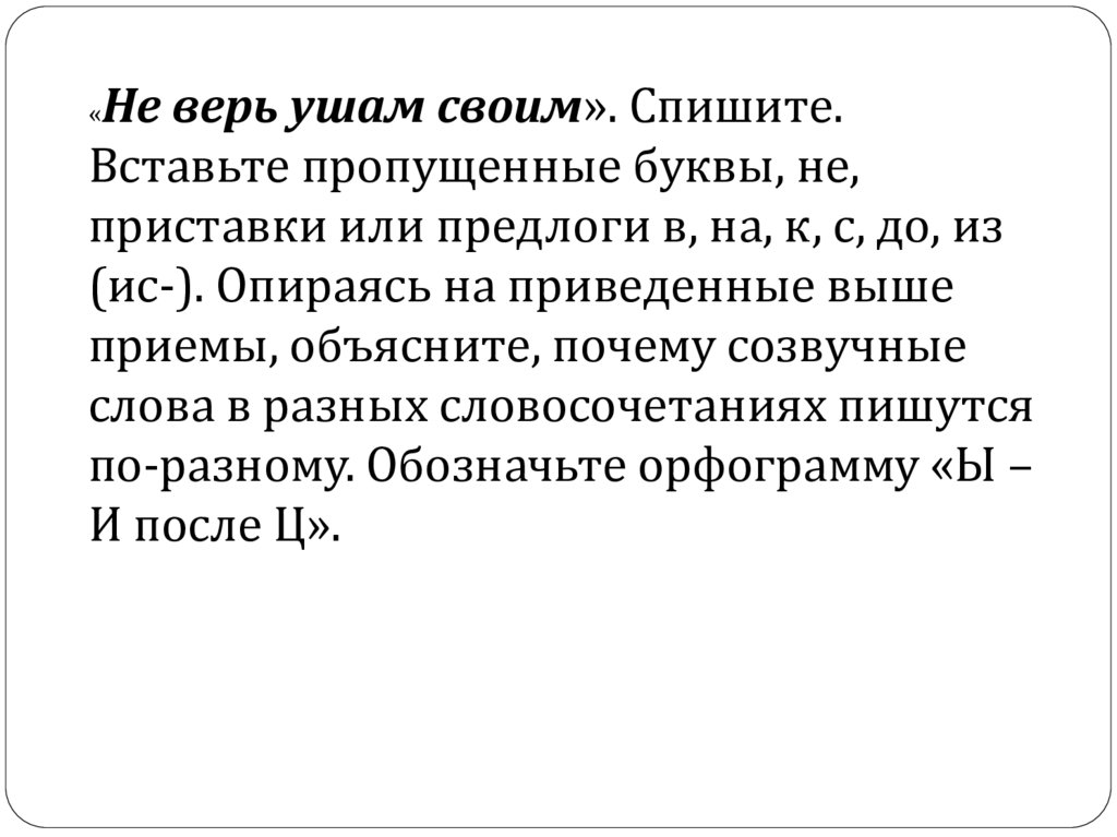 Не верь ушам своим». Спишите.Вставьте пропущенные буквы, не,