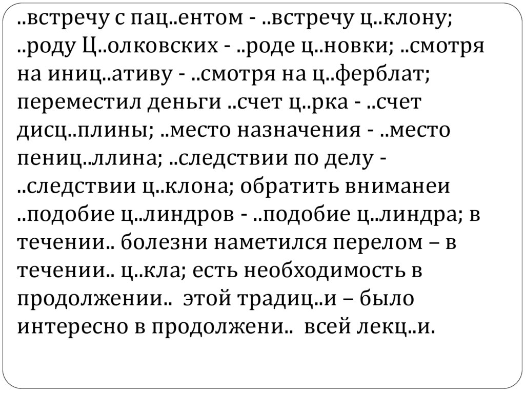 ..встречу с пац..ентом - ..встречу ц..клону;..роду Ц..олковских - ..роде ц..новки; ..смотря