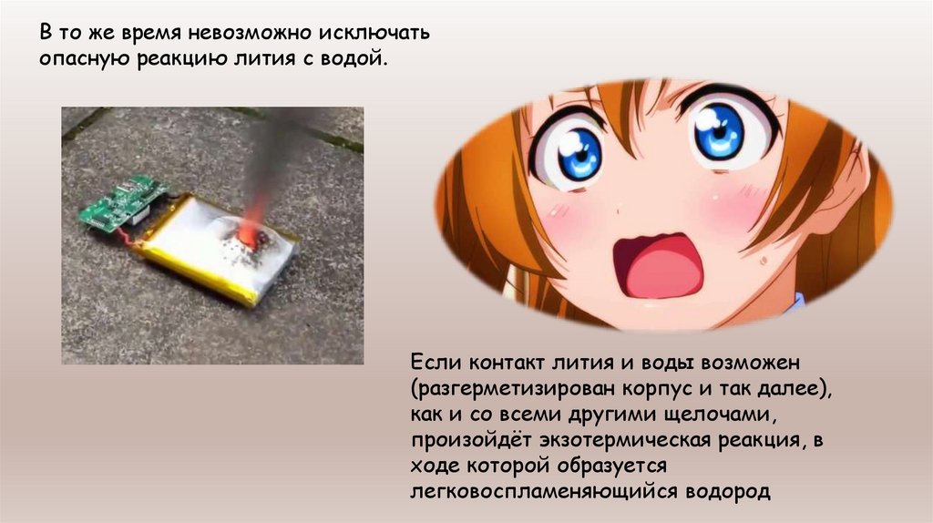 В то же время невозможно исключатьопасную реакцию лития с водой.