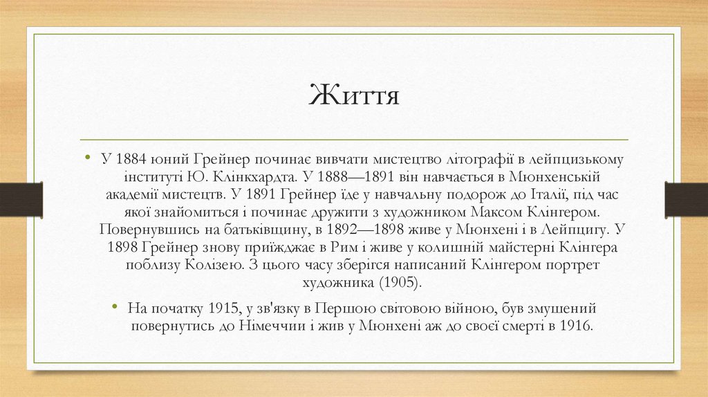 Життя• У 1884 юний Грейнер починає вивчати мистецтво літографії в лейпцизькому