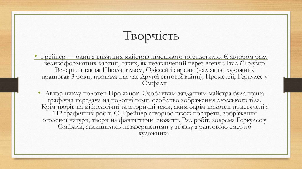 Творчість• Грейнер — один з видатних майстрів німецького югендстилю. Є автором ряду