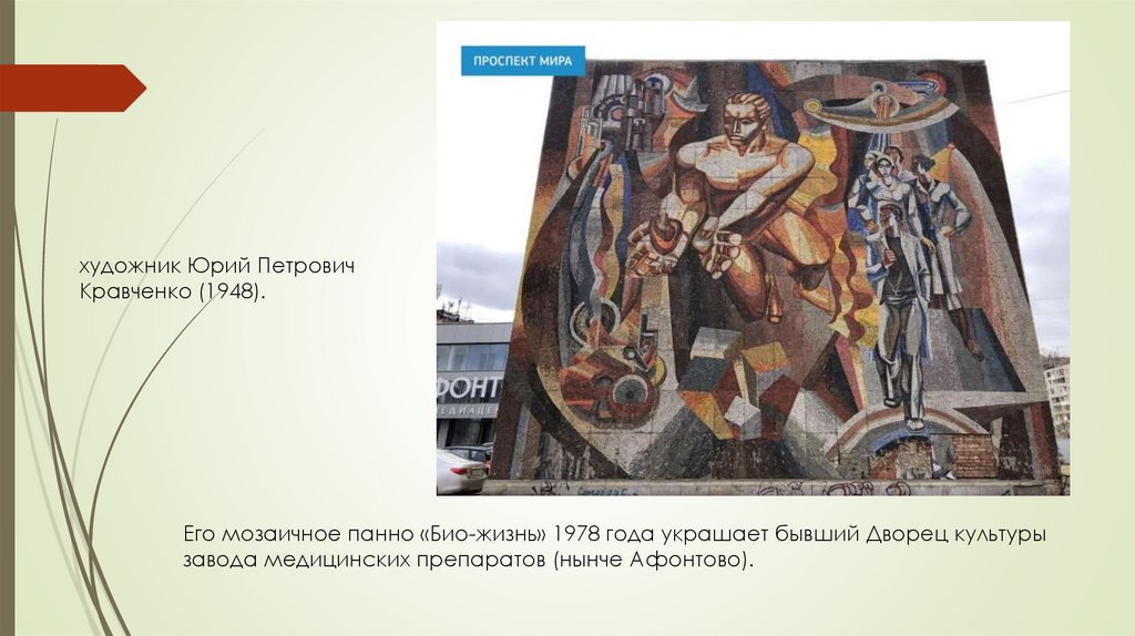 Его мозаичное панно «Био-жизнь» 1978 года украшает бывший Дворец культуры