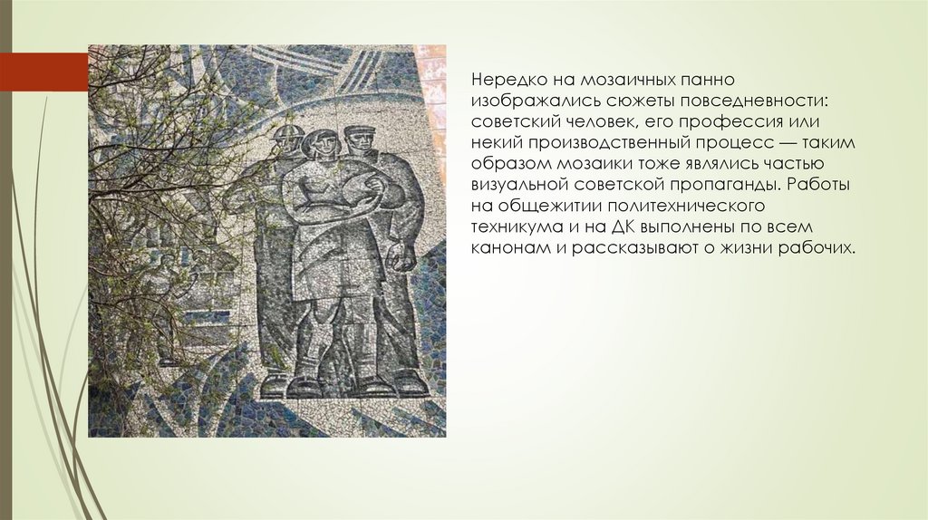 В годы Советской власти мозаика становиться неотъемлемой частью архитектурного облика