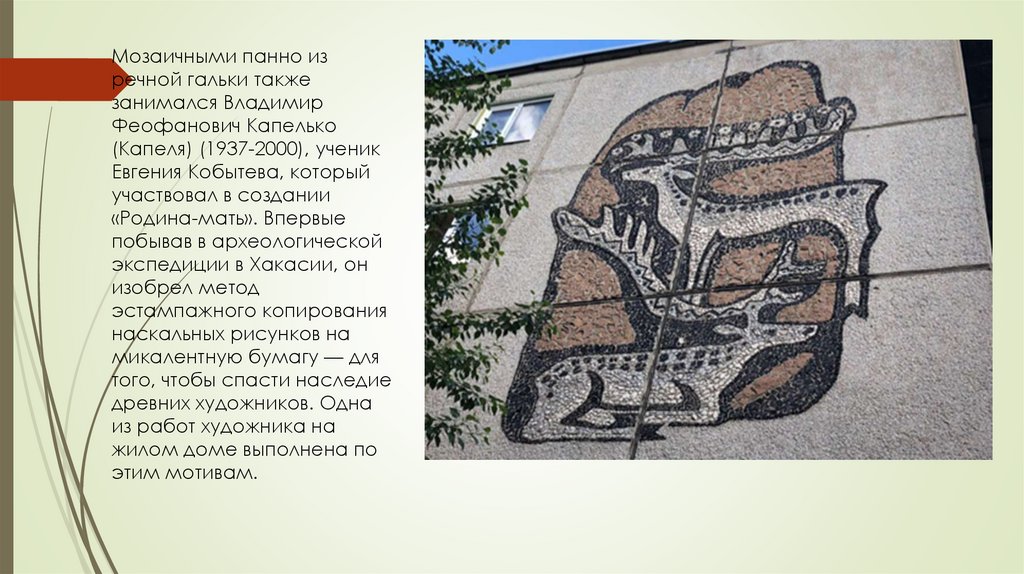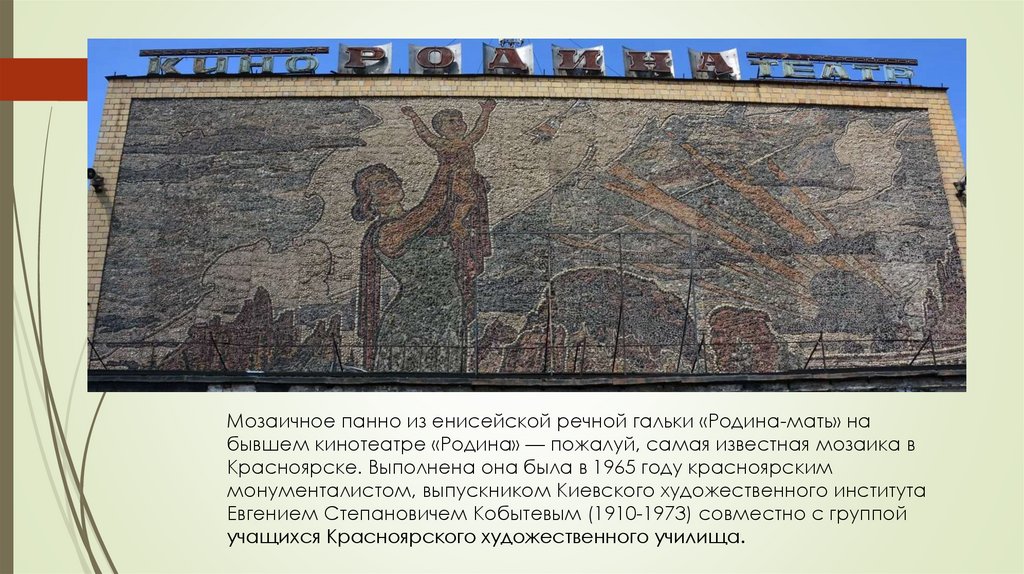 Мозаичное панно из енисейской речной гальки «Родина-мать» набывшем кинотеатре «Родина» — пожалуй, самая известная мозаика в