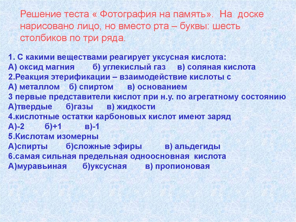 Решение теста « Фотография на память». На доскенарисовано лицо, но вместо рта – буквы: шесть