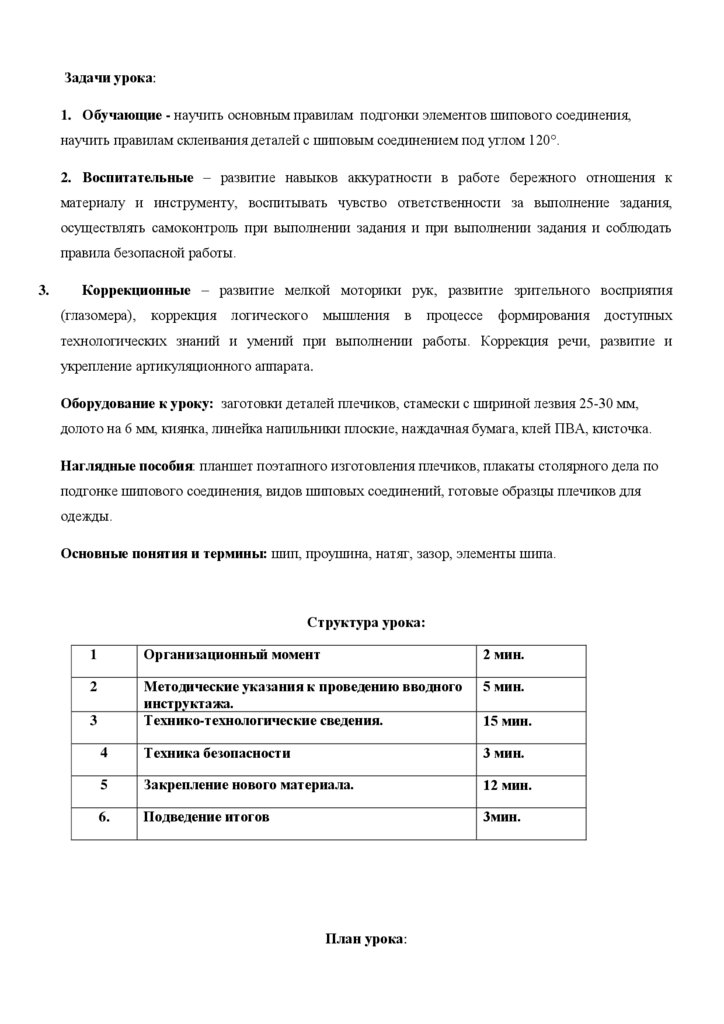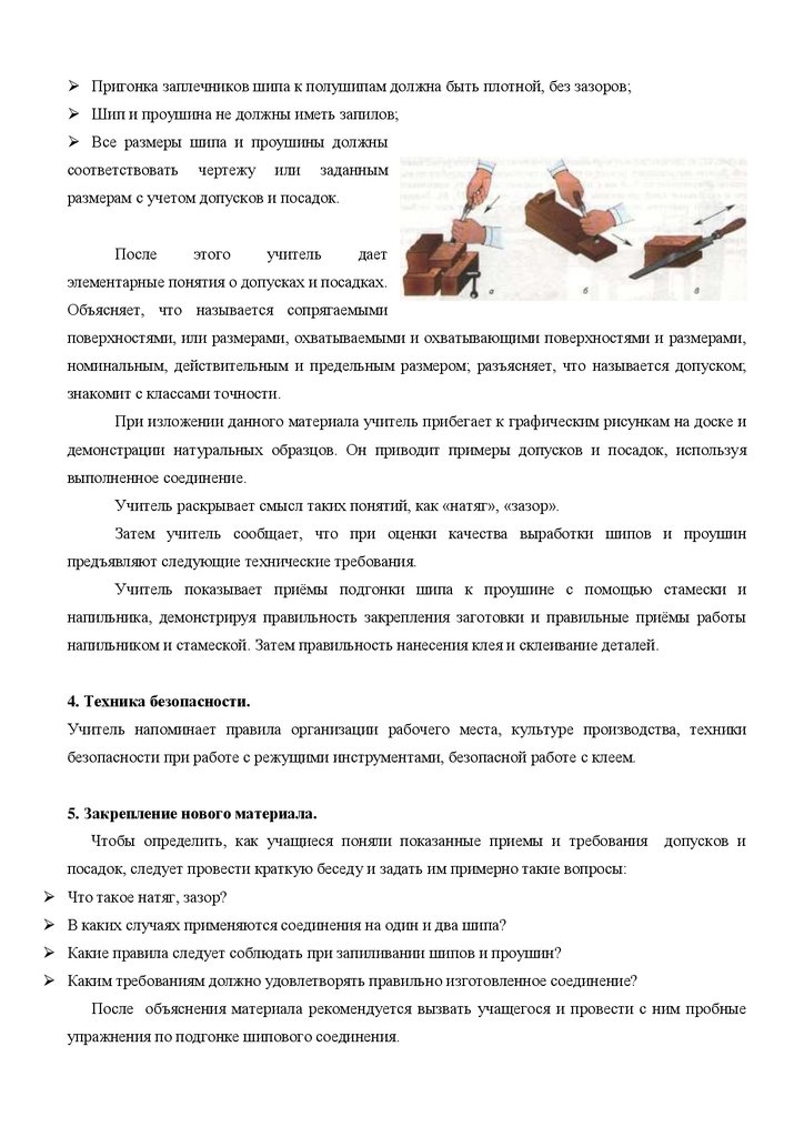 Задачи урока:1. Обучающие - научить основным правилам подгонки элементов шипового соединения,