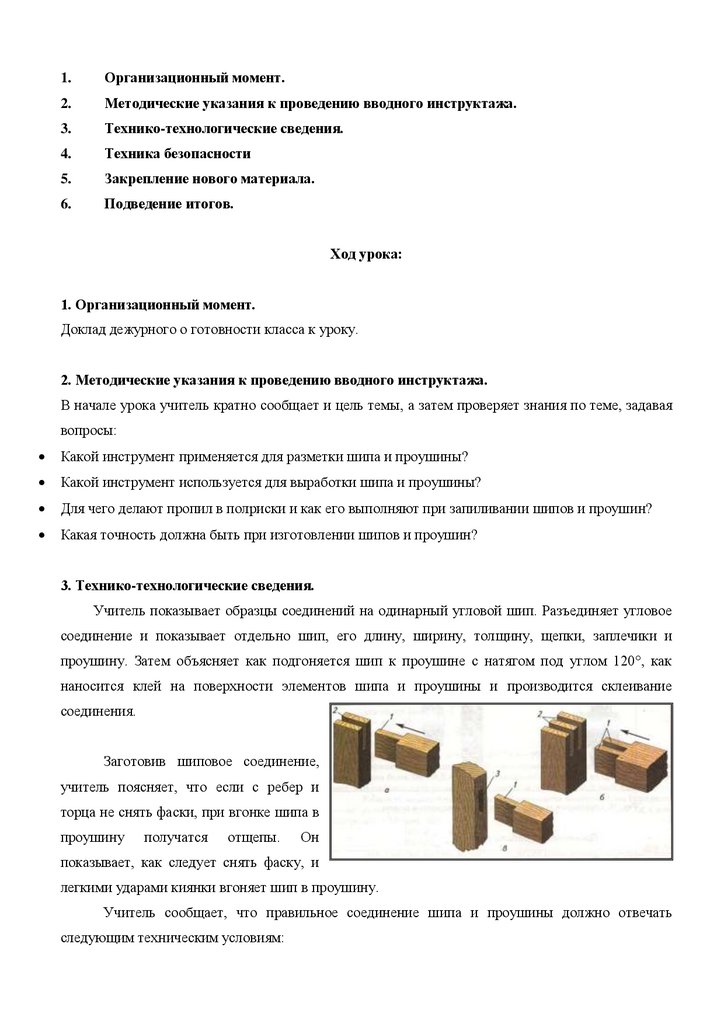 Учитель показывает образцы соединений на одинарный угловой шип. Разъединяет угловое