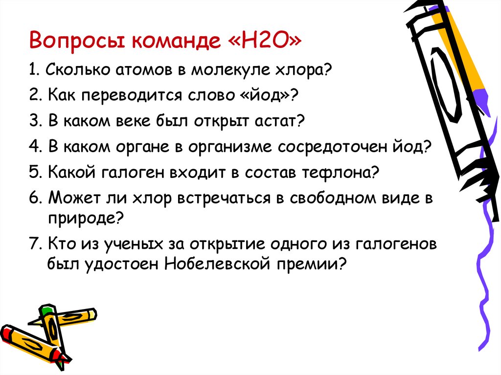 Вопросы команде «Н2О»1. Сколько атомов в молекуле хлора?