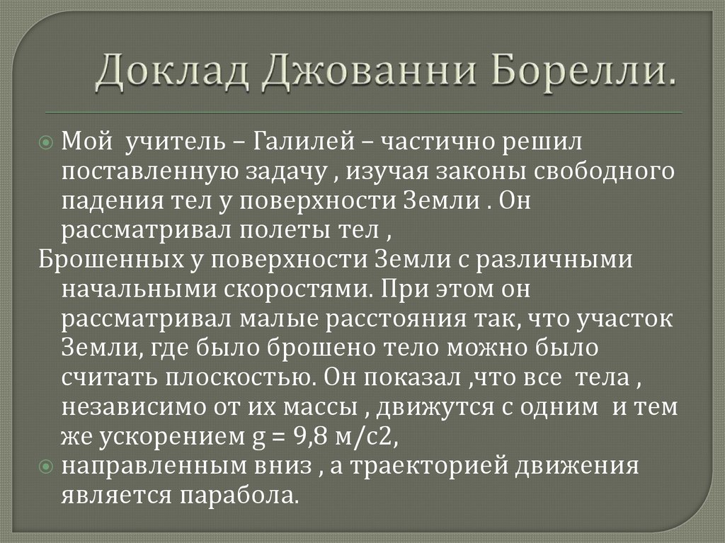 Мой учитель – Галилей – частично решилпоставленную задачу , изучая законы свободного