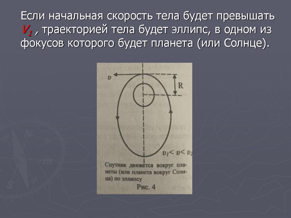 Если начальная скорость тела будет превышатьV1 , траекторией тела будет эллипс, в одном из