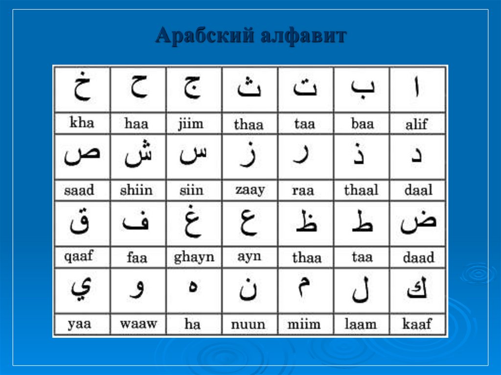 Арабский алфавит15. Графика - это совокупность особых знаков, с помощью которых устная речь передается на письме (буквы, знаки препинания, пробелы