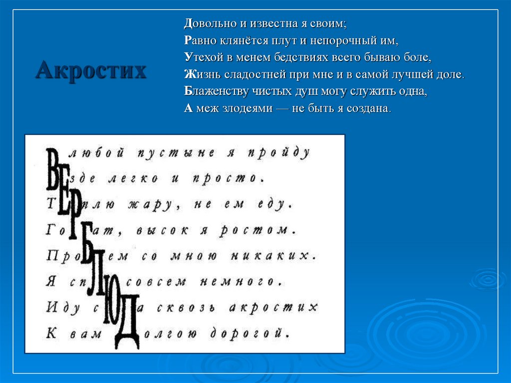 и т.д)Акростих – стихотворение, в котором некоторые, чаще