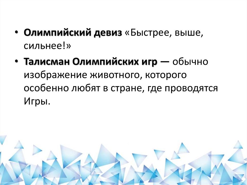 • Олимпийский девиз «Быстрее, выше,сильнее!»