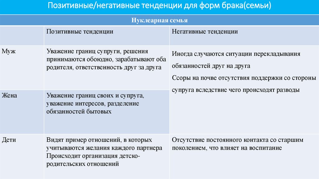 Позитивные/негативные тенденции для форм брака(семьи)Нуклеарная семья