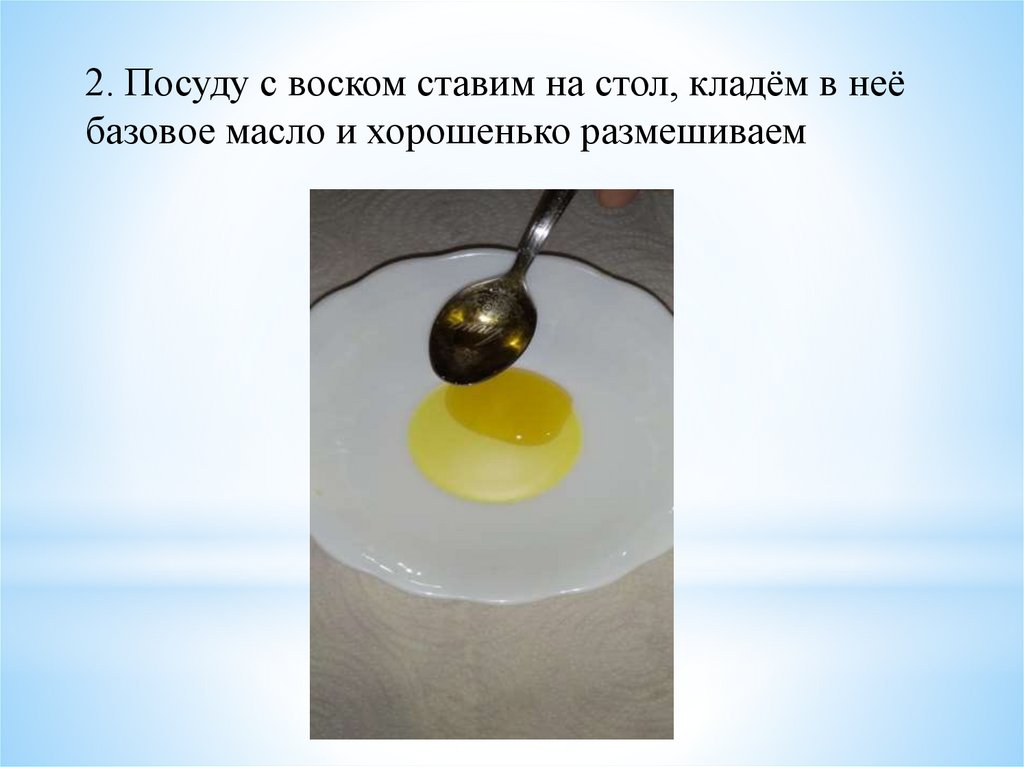 2. Посуду с воском ставим на стол, кладём в неёбазовое масло и хорошенько размешиваем