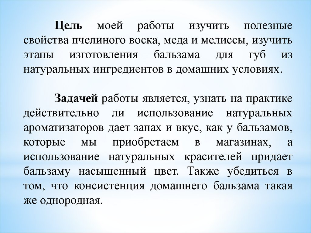 Цель моей работы изучить полезныесвойства пчелиного воска, меда и мелиссы, изучить