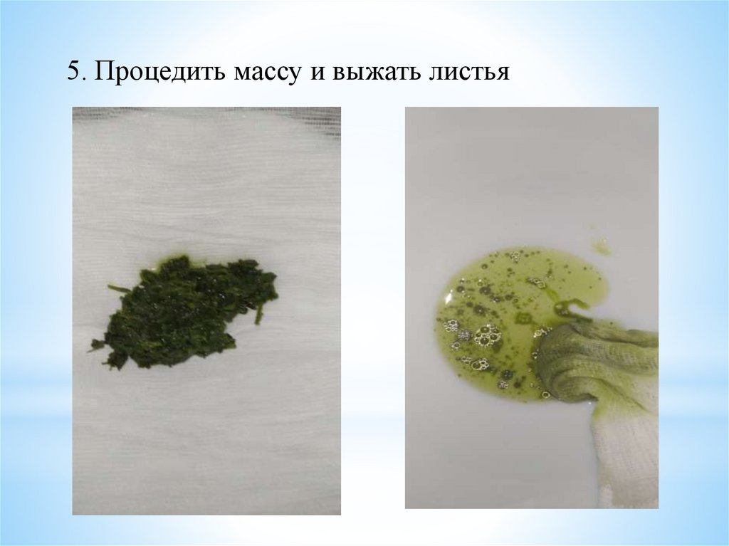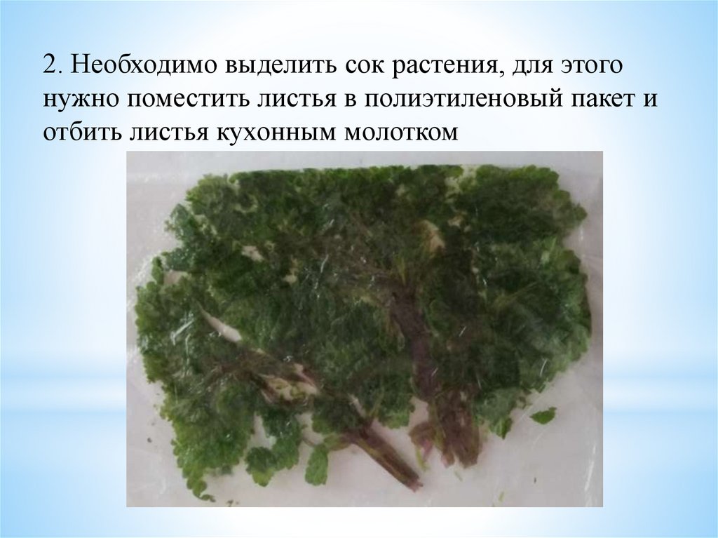 2. Необходимо выделить сок растения, для этогонужно поместить листья в полиэтиленовый пакет и