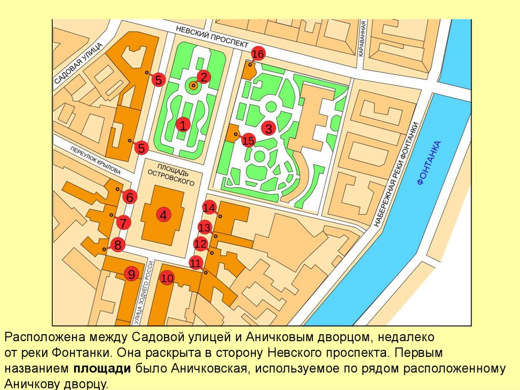 Расположена между Садовой улицей и Аничковым дворцом, недалекоот реки Фонтанки. Она раскрыта в сторону Невского проспекта. Первым