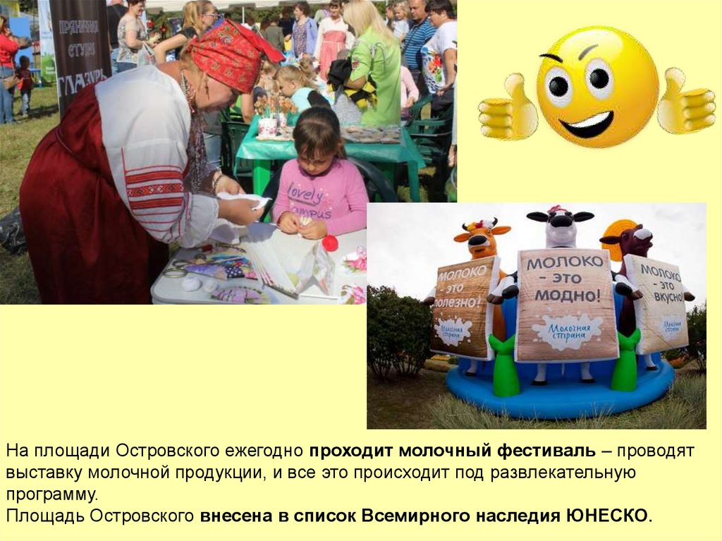На площади Островского ежегодно проходит молочный фестиваль – проводятвыставку молочной продукции, и все это происходит под развлекательную