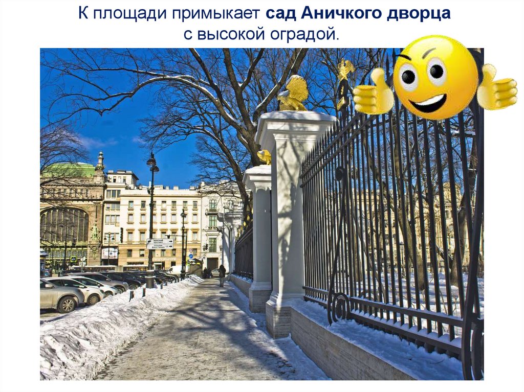 К площади примыкает сад Аничкого дворцас высокой оградой.