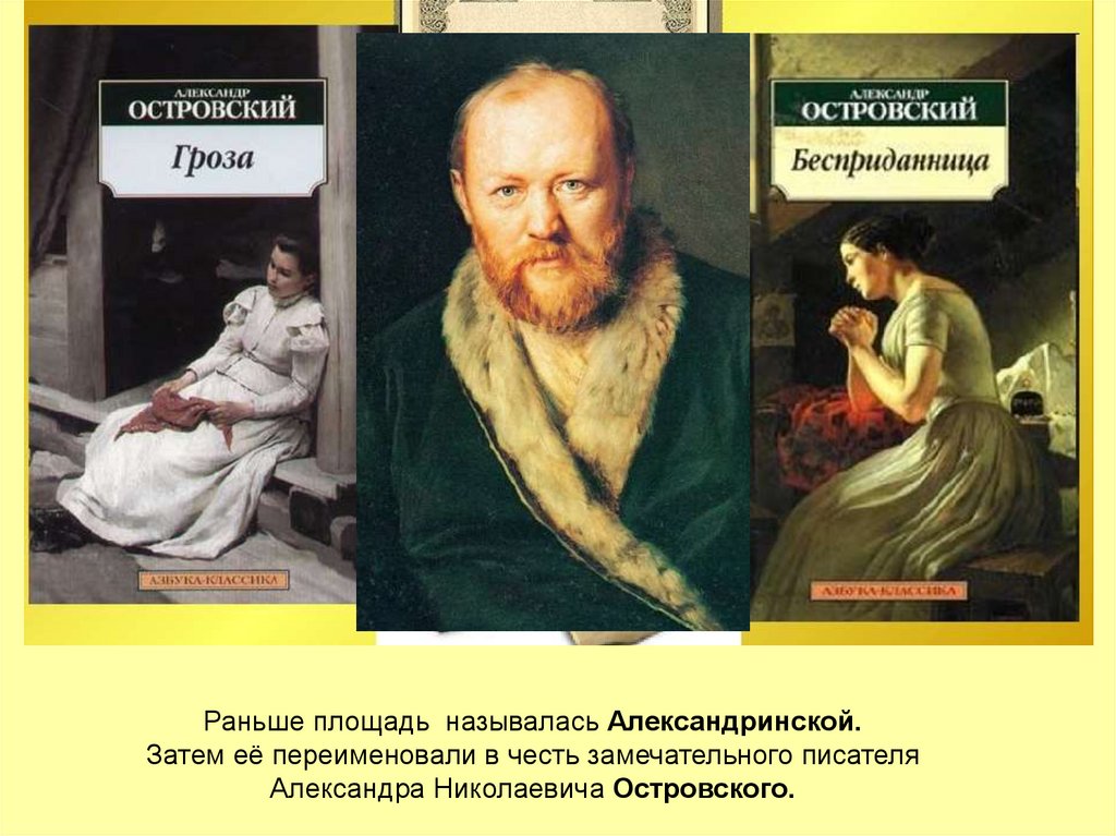 Раньше площадь называлась Александринской.Затем её переименовали в честь замечательного писателя