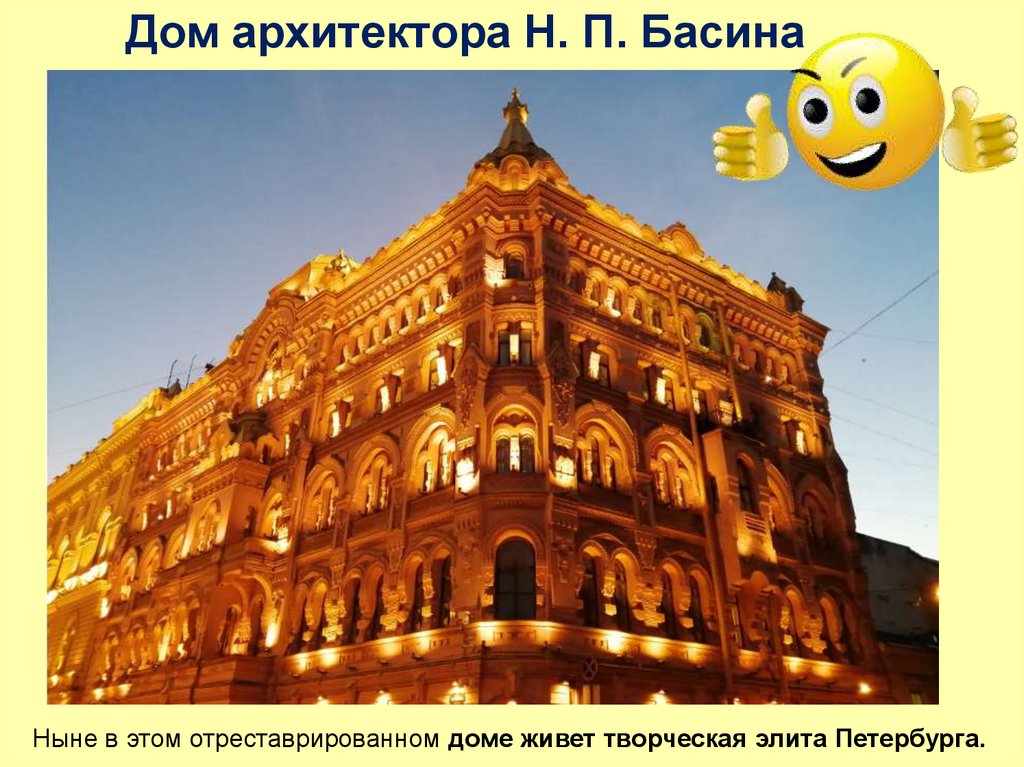 Дом архитектора Н. П. БасинаНыне в этом отреставрированном доме живет творческая элита Петербурга.