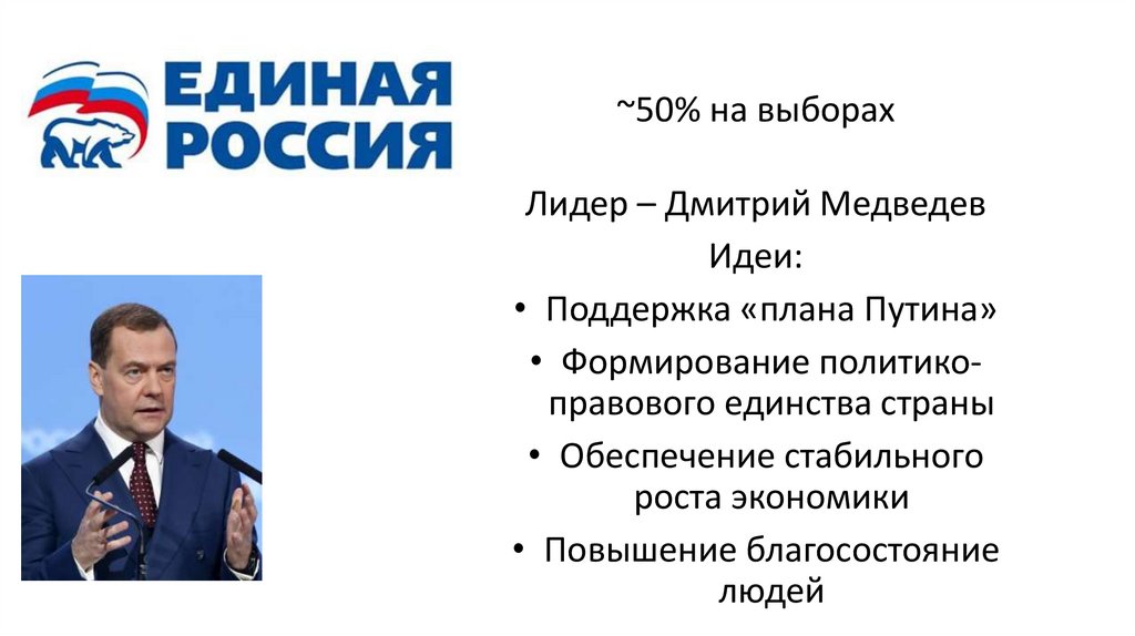 ~50% на выборахЛидер – Дмитрий Медведев