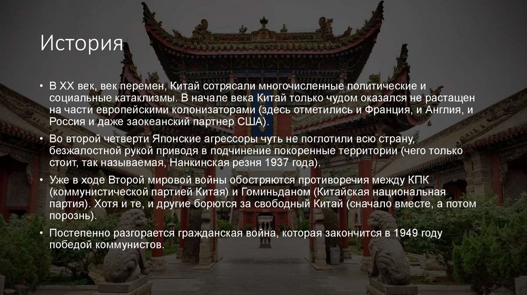История• В ХХ век, век перемен, Китай сотрясали многочисленные политические и