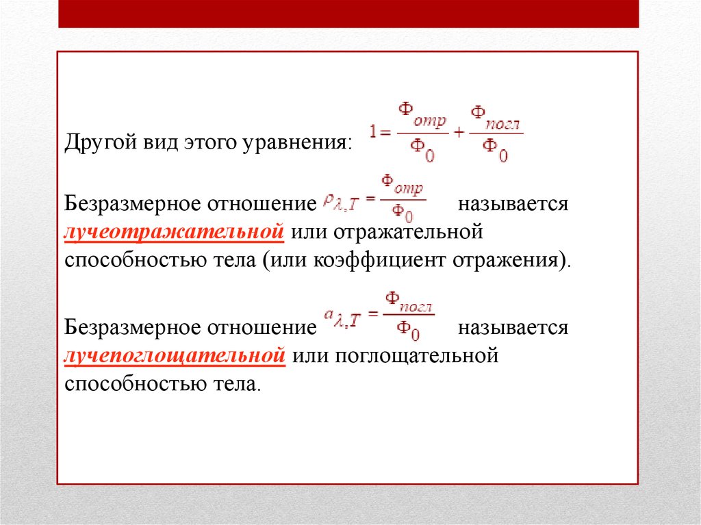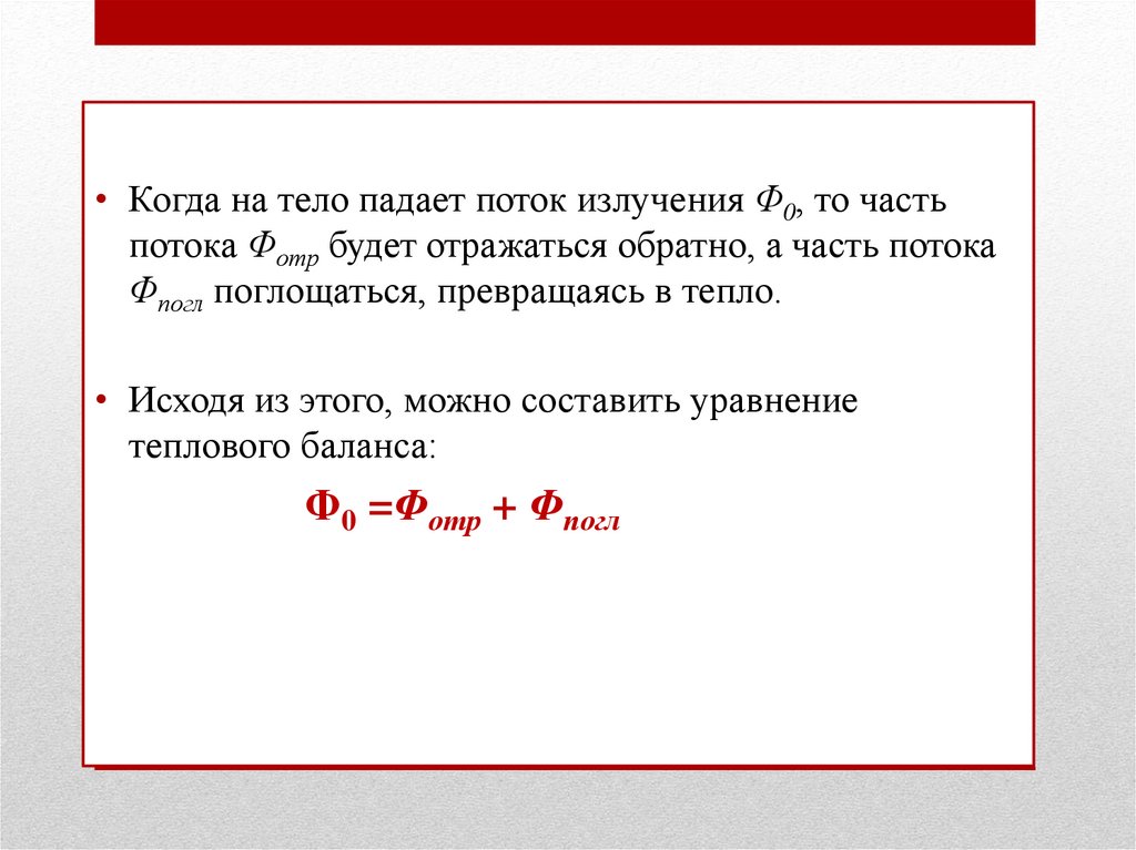 • Когда на тело падает поток излучения Φ0, то частьпотока Φотр будет отражаться обратно, а часть потока