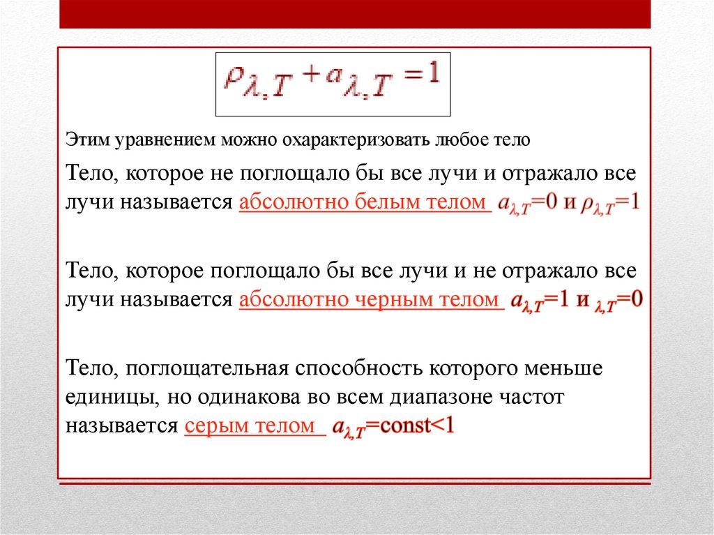 Этим уравнением можно охарактеризовать любое телоТело, которое не поглощало бы все лучи и отражало все