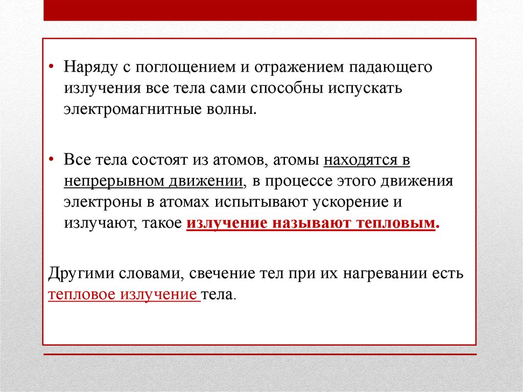 • Наряду с поглощением и отражением падающегоизлучения все тела сами способны испускать