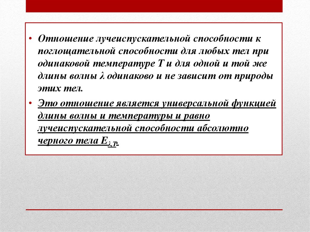• Отношение лучеиспускательной способности кпоглощательной способности для любых тел при