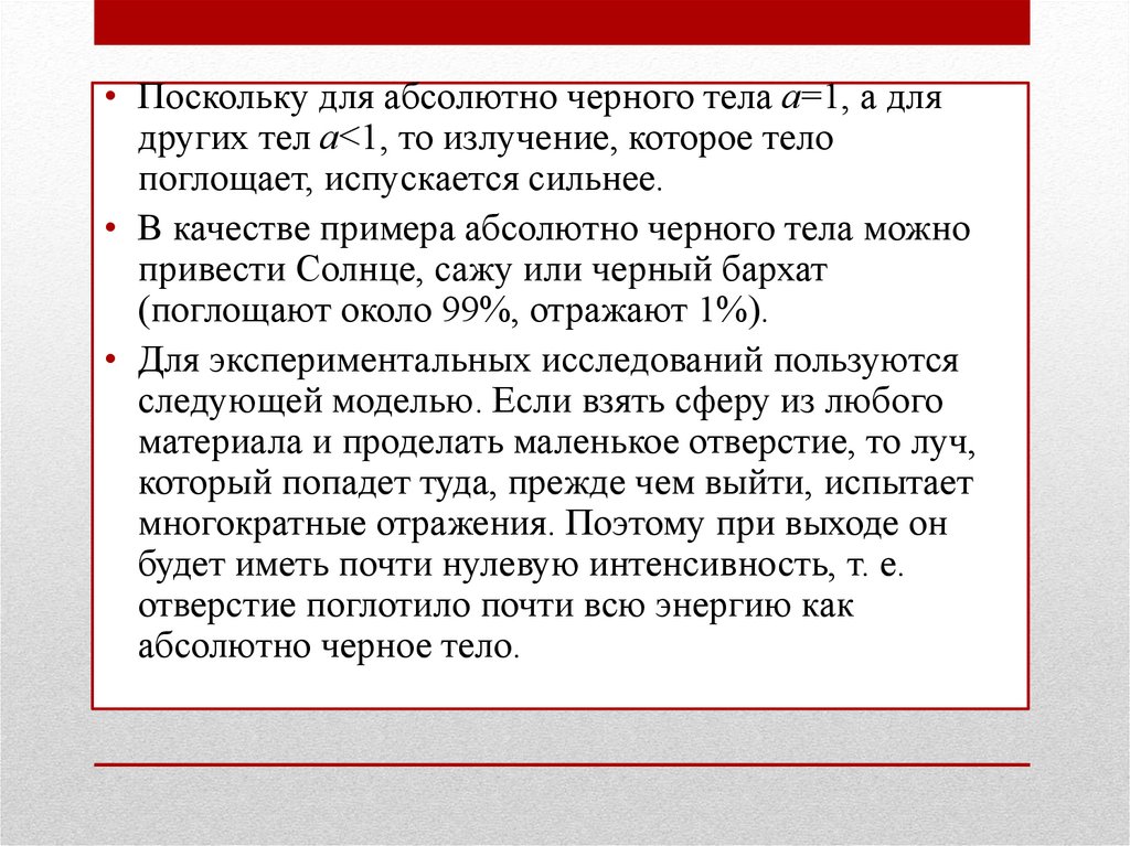 • Поскольку для абсолютно черного тела а=1, а длядругих тел а<1, то излучение, которое тело