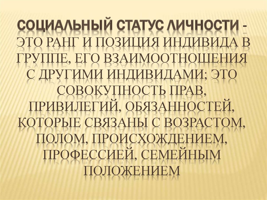 СОЦИАЛЬНЫЙ СТАТУС ЛИЧНОСТИ ЭТО РАНГ И ПОЗИЦИЯ ИНДИВИДА ВГРУППЕ, ЕГО ВЗАИМООТНОШЕНИЯ