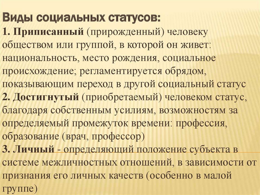 Виды социальных статусов:1. Приписанный (прирожденный) человеку