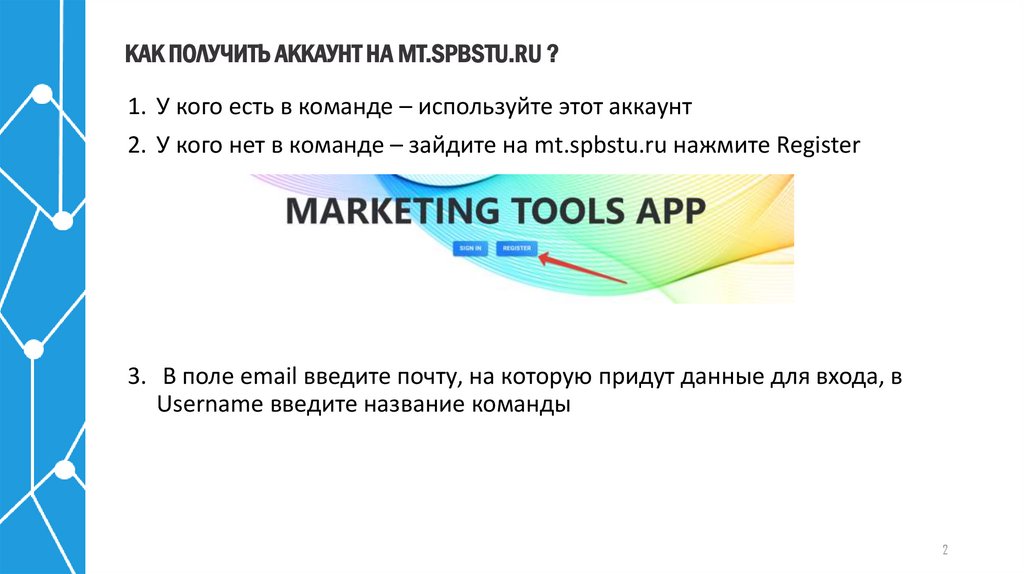 КАК ПОЛУЧИТЬ АККАУНТ НА MT.SPBSTU.RU ?1. У кого есть в команде – используйте этот аккаунт
