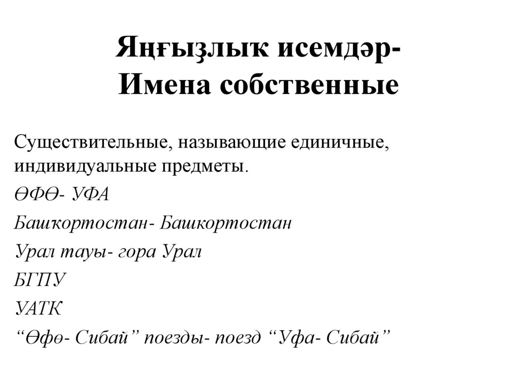 Яңғыҙлыҡ исемдәрИмена собственныеСуществительные, называющие единичные,