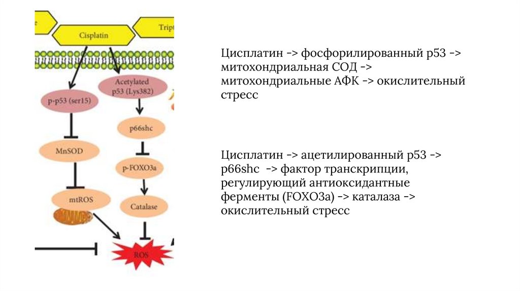 Цисплатин -> фосфорилированный p53 ->митохондриальная СОД ->