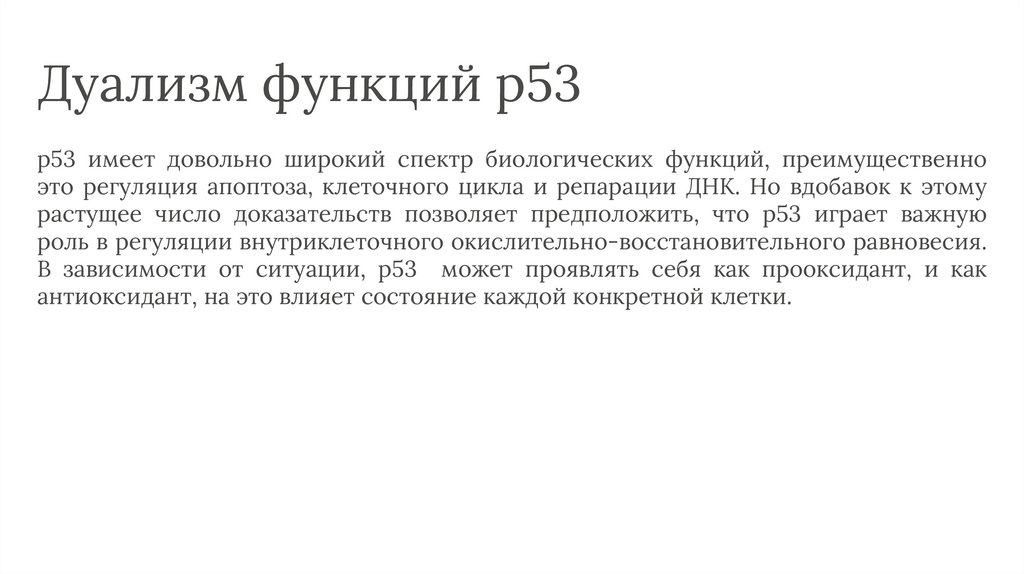 Дуализм функций p53p53 имеет довольно широкий спектр биологических функций, преимущественно